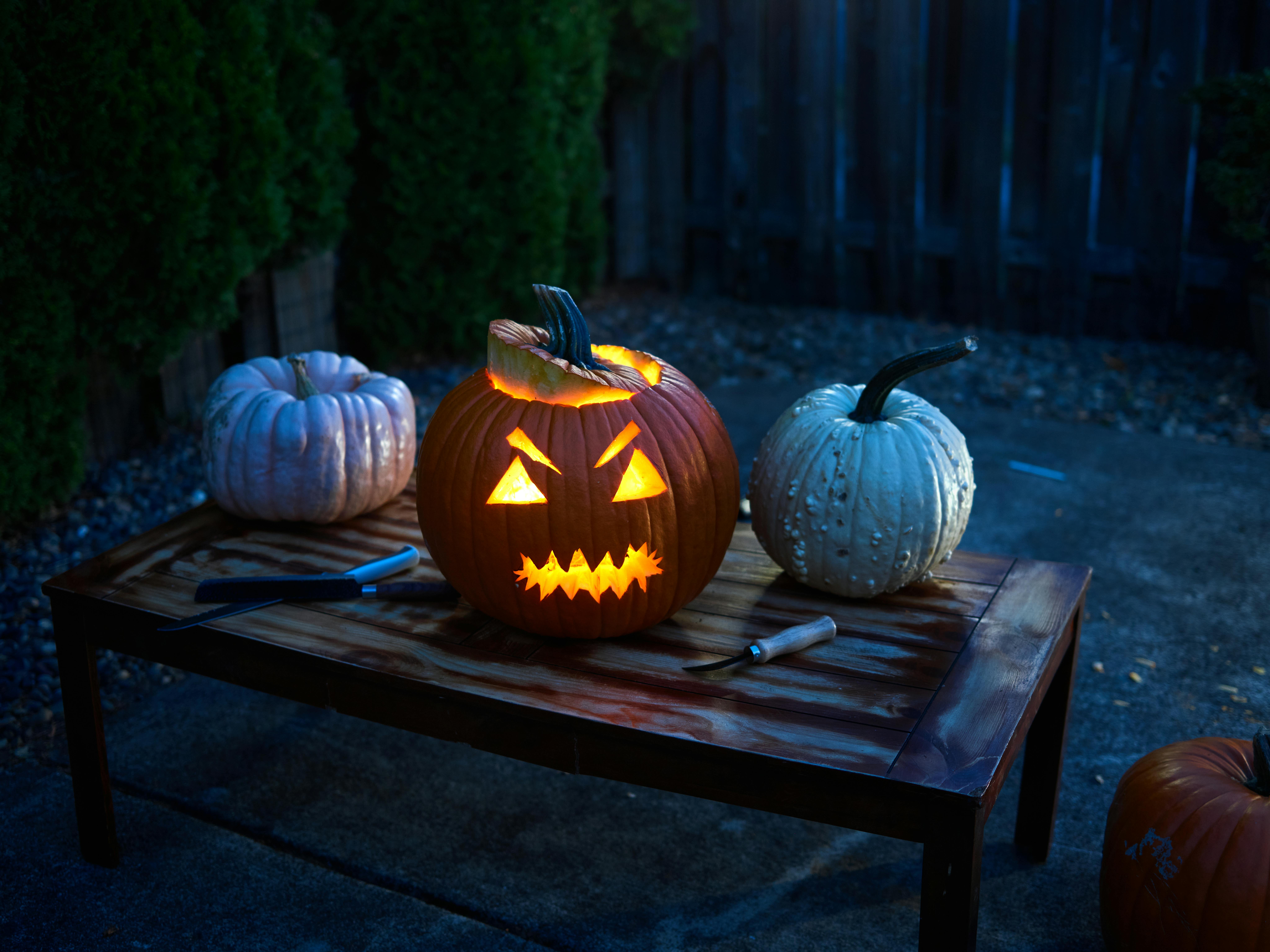 • Use orange and purple string lights and spotlights to enhance outdoor Halloween decorations for a festive glow.